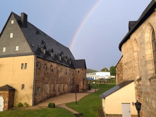 Ihr könnt wählen: Die Zeremonie findet in der Christuskirche in Mönchröden statt. Wenn ihr lieber unter freiem Himmel gesegnet werden möchtet, ist das unter Bäumen in der ehemaligen Klosteranlage auch möglich und schön. Treffpunkt ist auf jeden Fall das Refektorium, in dem die Kennenlerngespräche stattfinden. Es liegt gleich neben der Kirche.