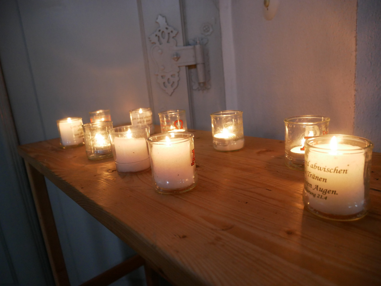 In unseren Abendgottesdiensten wollen wir versuchen ein bisschen von der Atmosphäre dieses Ortes, von der Taizé-Bewegung in unseren Gottesdienst zu holen. Viele Lichter werden angezündet. Wir dürfen auf dem Boden sitzen oder knieen, aber auch in den Bänken- jede*r wie er/oder sie möchte. Wir singen Lieder aus Taizé, hören die Bibellesungen in verschieden Sprachen, dürfen uns einlassen auf die Stille, bei den Fürbitten beten wir mit- und füreinander. Alle sind eingeladen mit eigenen Worten und in ihrer Muttersprache zu beten.